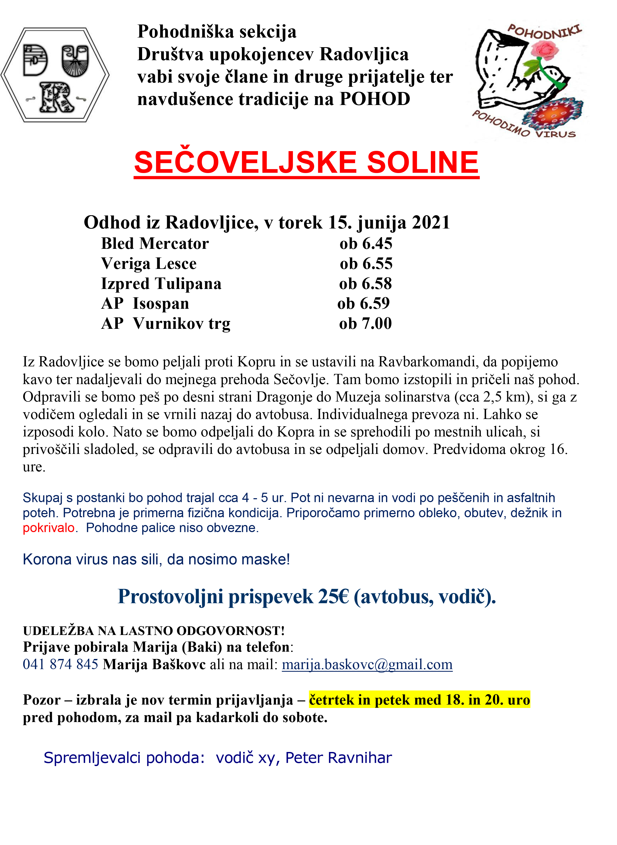 Iz Radovljice se bomo peljali proti Kopru in se ustavili na Ravbarkomandi, da popijemo kavo ter nadaljevali do mejnega prehoda Sečovlje. Tam bomo izstopili in pričeli naš pohod. Odpravili se bomo peš po desni strani Dragonje do Muzeja solinarstva (cca 2,5 km), si ga z vodičem ogledali in se vrnili nazaj do avtobusa. Individualnega prevoza ni. Lahko se izposodi kolo. Nato se bomo odpeljali do Kopra in se sprehodili po mestnih ulicah, si privoščili sladoled, se odpravili do avtobusa in se odpeljali domov. Predvidoma okrog 16. ure.
