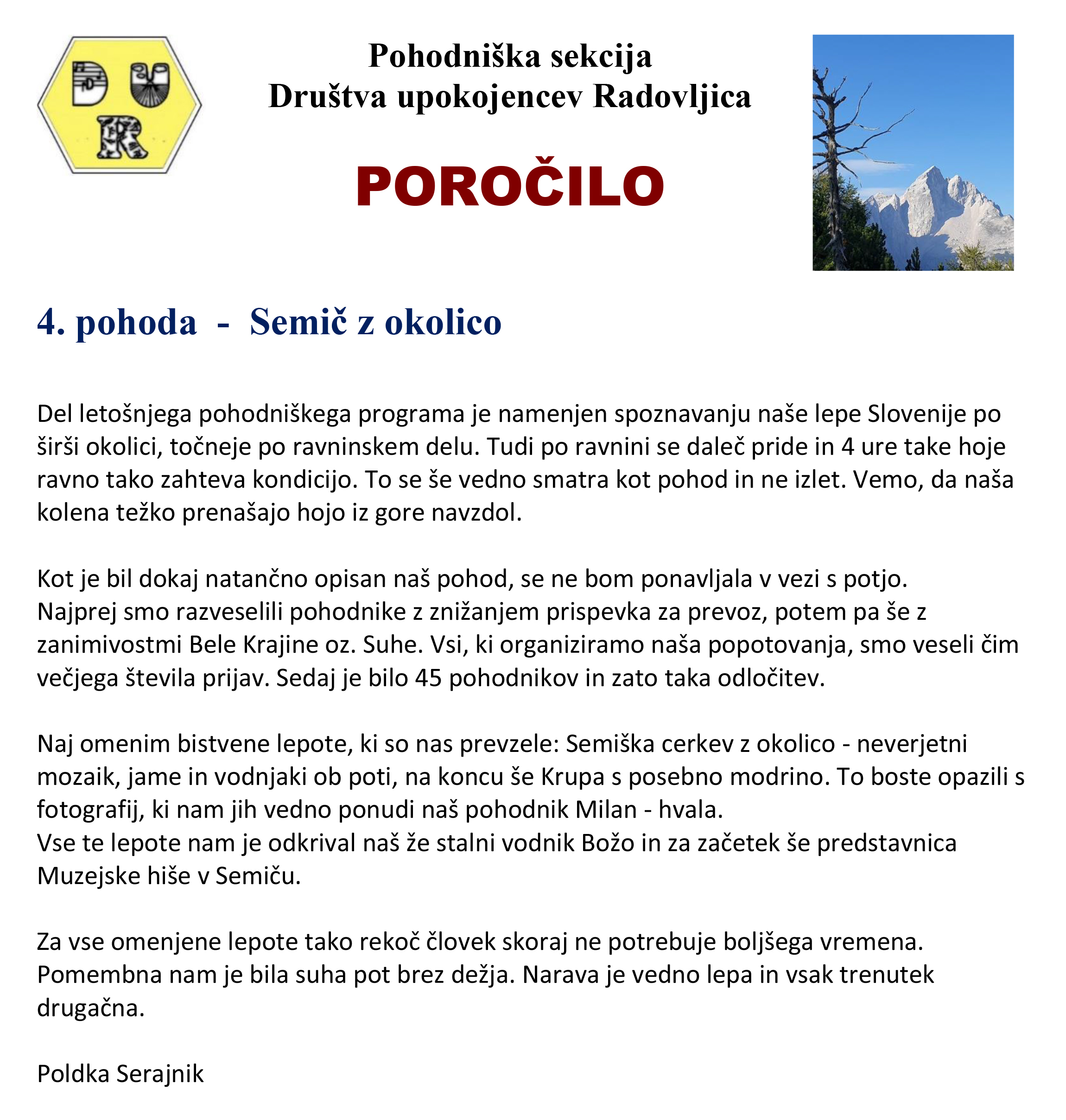 Del letošnjega pohodniškega programa je namenjen spoznavanju naše lepe Slovenije po širši okolici , točneje po ravninskem delu . Tudi po ravnini se daleč pride in 4 ure take hoje ravno tako zahteva kondicijo.