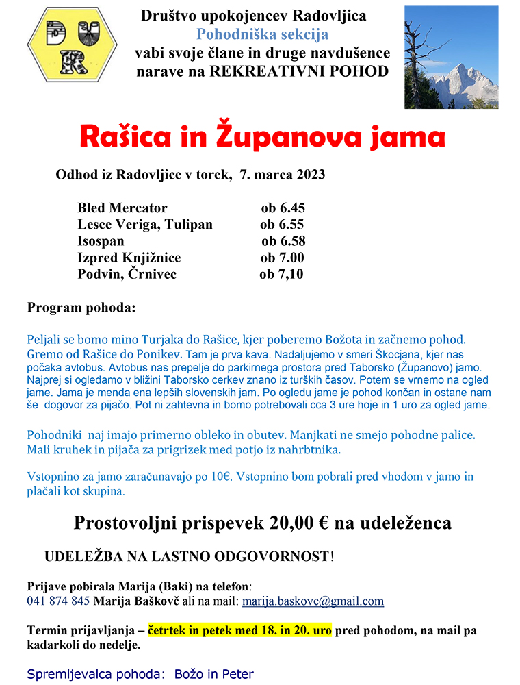 Odhod iz Radovljice v torek, 7. marca 2023