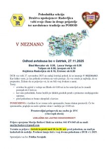 DUR vas vabi v četrtek, 27. novembra 2025, na zadnji letošnji pohod, ki se imenuje V NEZNANO – podrobneje v spodnjem vabilu…