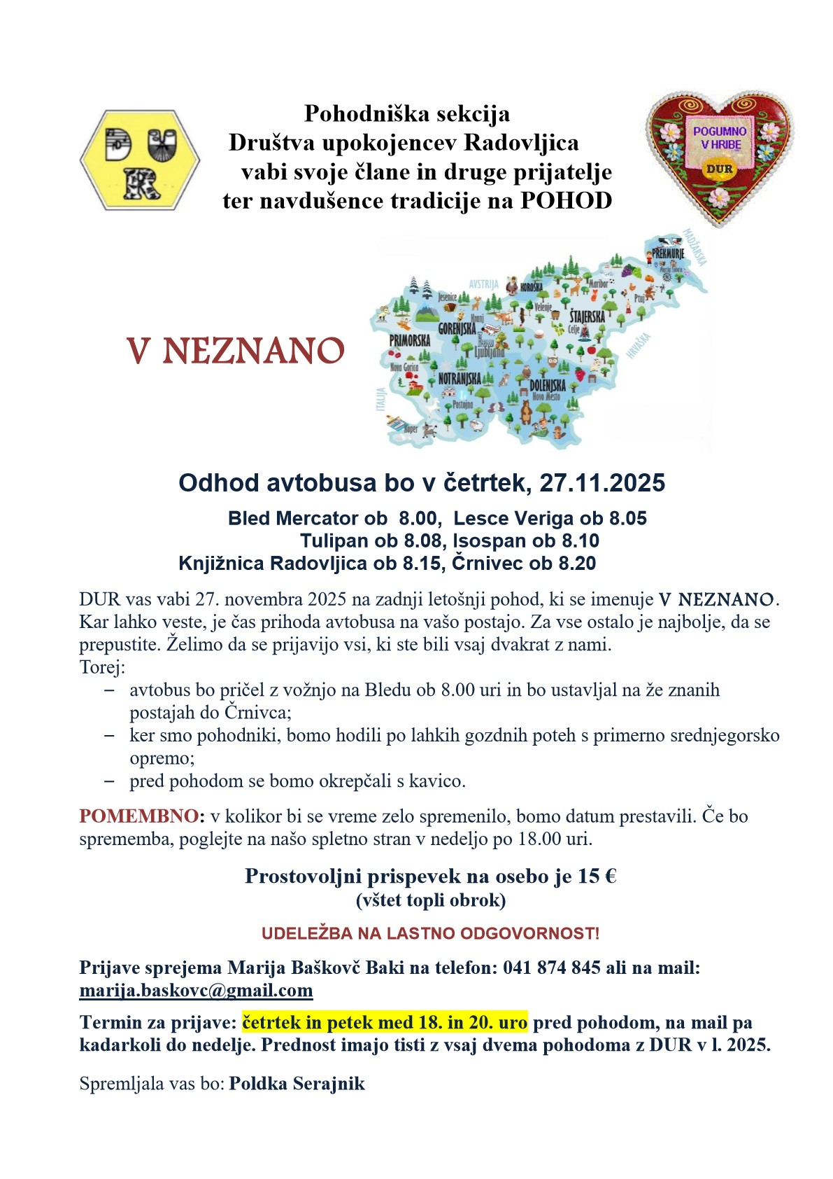 Prijave sprejema Marija Baškovč Baki na telefon: 041 874 845 ali na mail: marija.baskovc@gmail.com. Prednost imajo tisti, z vsaj dvema pohodoma z DUR v letu 2025.