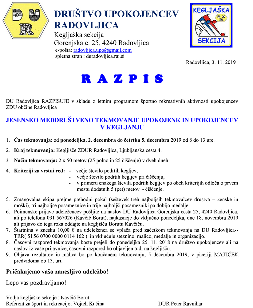 - Kraj tekmovanja: Kegljišče ZDUR Radovljica, Ljubljanska cesta 4.
