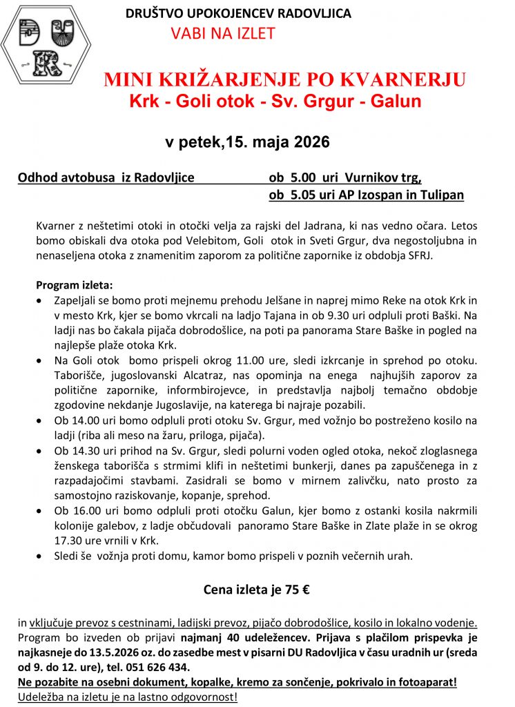 Krk – Goli otok – Sv. Grgur – Galun v petek, dne 15. maja 2026